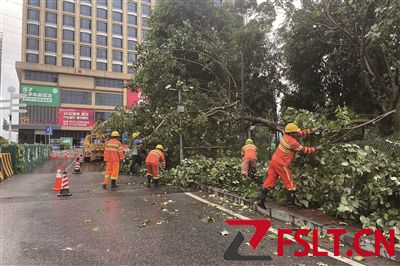 25日清晨,禪城區(qū)園林工人在季華路湖涌大道處理黃槿斷枝。/部門供圖