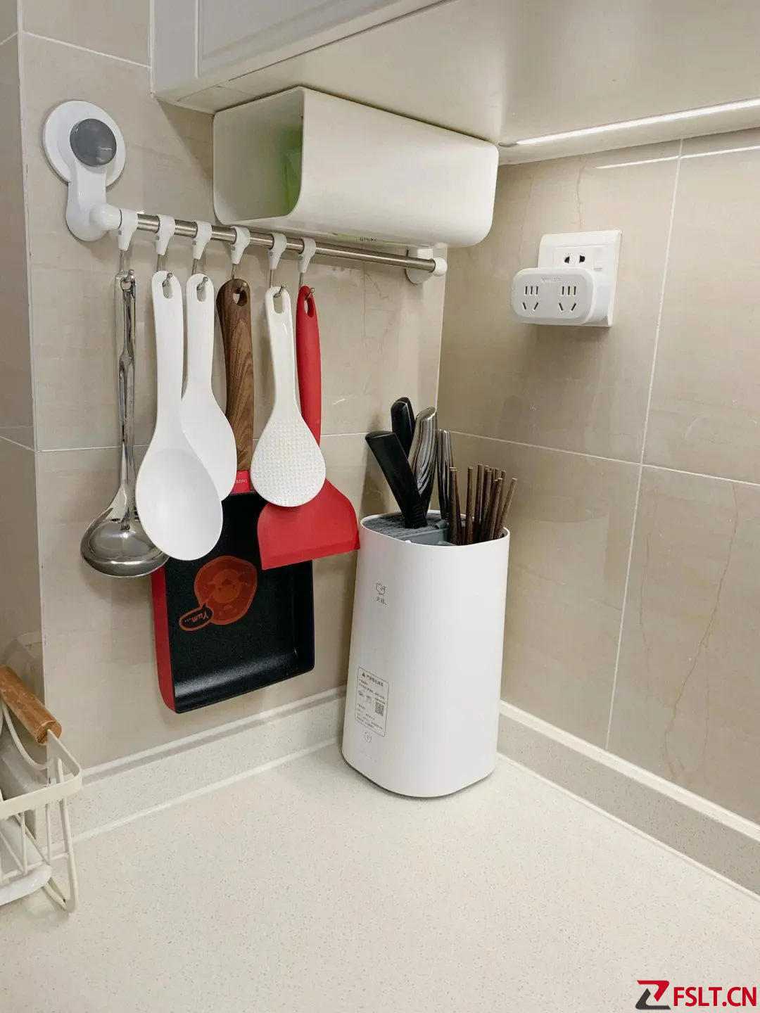 櫥柜拐角位置安裝了吸盤(pán)式掛桿,用來(lái)收納常用的廚具小用品,屋主還貼心地添置了一個(gè)消毒刀筷架,既能收納又能烘干消毒,每次使用都更加安心。