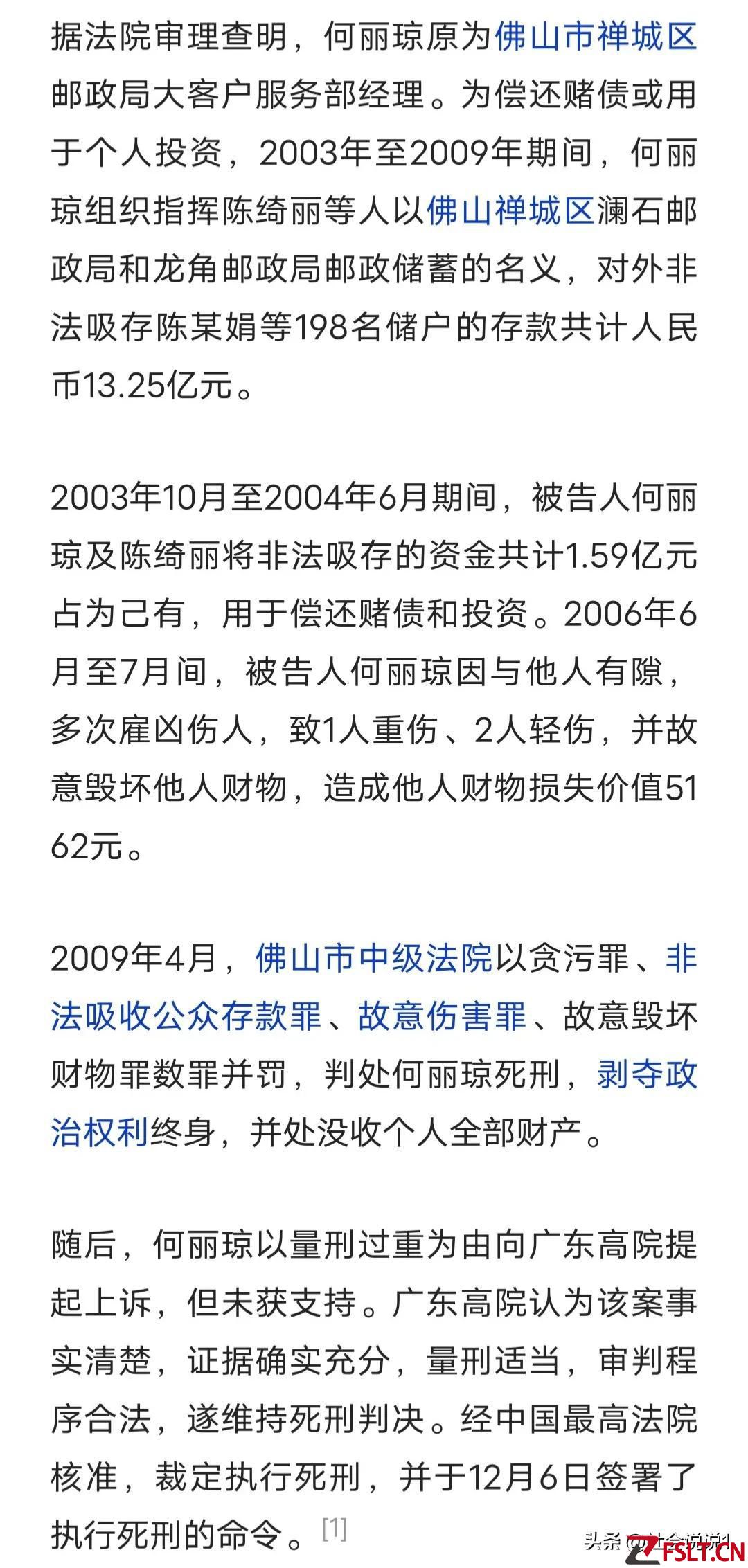 何麗瓊于2009年4月24日在佛山市中級人民法院一審被判死刑。