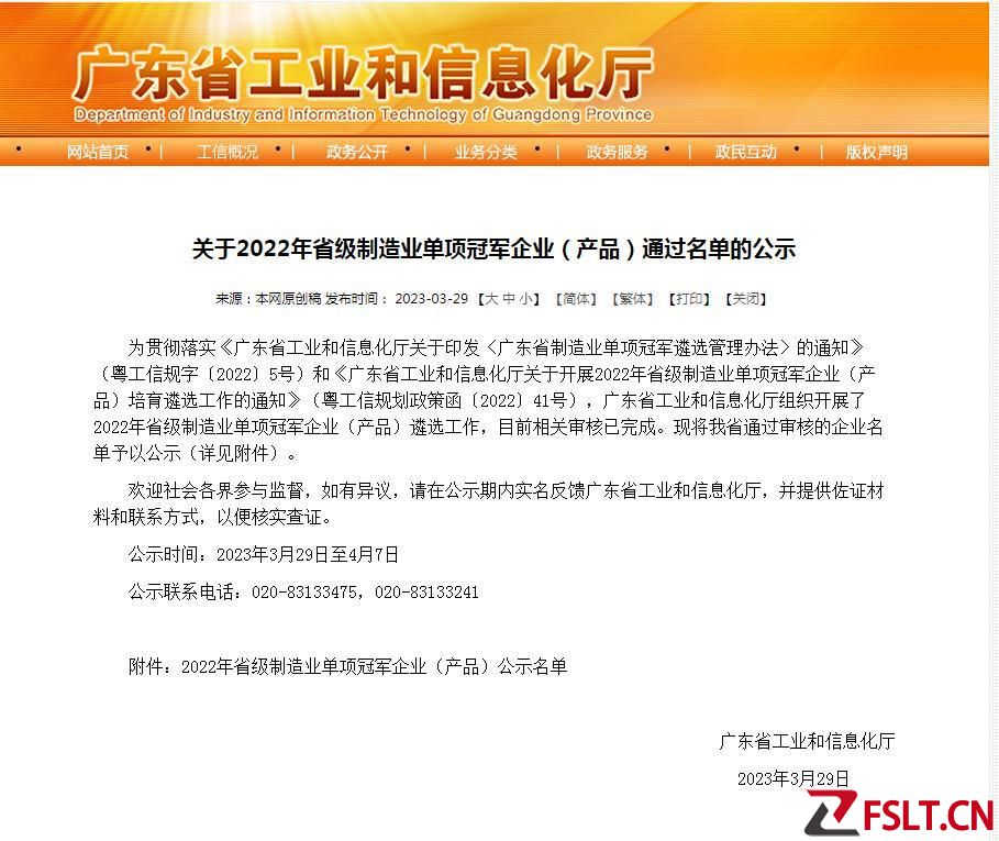 近日,廣東省工業(yè)和信息化廳發(fā)布《關(guān)于2022年省級制造業(yè)單項冠軍企業(yè)(產(chǎn)品)通過名單的公示》。為貫徹落實《廣東省工業(yè)和信息化廳關(guān)于印發(fā)〈廣東省制造業(yè)單項冠軍遴選管理辦法〉的通知》(粵工信規(guī)字〔2022〕5號)和《廣東省工業(yè)和信息化廳關(guān)于開展2022年省級制造業(yè)單項冠軍企業(yè)(產(chǎn)品)培育遴選工作的通知》(粵工信規(guī)劃政策函〔2022〕41號),廣東省工業(yè)和信息化廳組織開展了2022年省級制造業(yè)單項冠軍企業(yè)(產(chǎn)品)遴選工作,目前相關(guān)審核已完成?,F(xiàn)將我省通過審核的企業(yè)名單予以公示(詳見附件)。公示時間:2023年3月29日至4月7日。