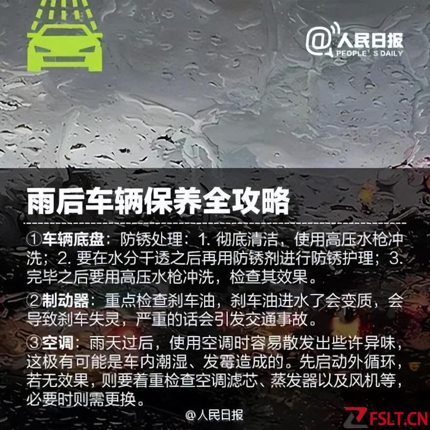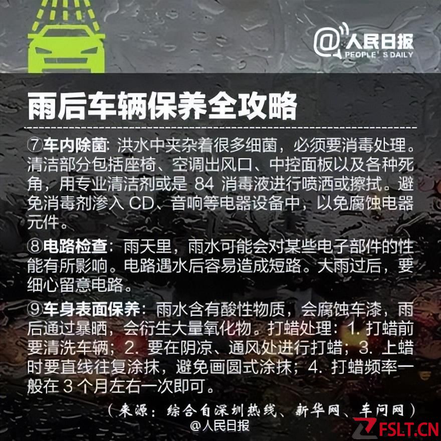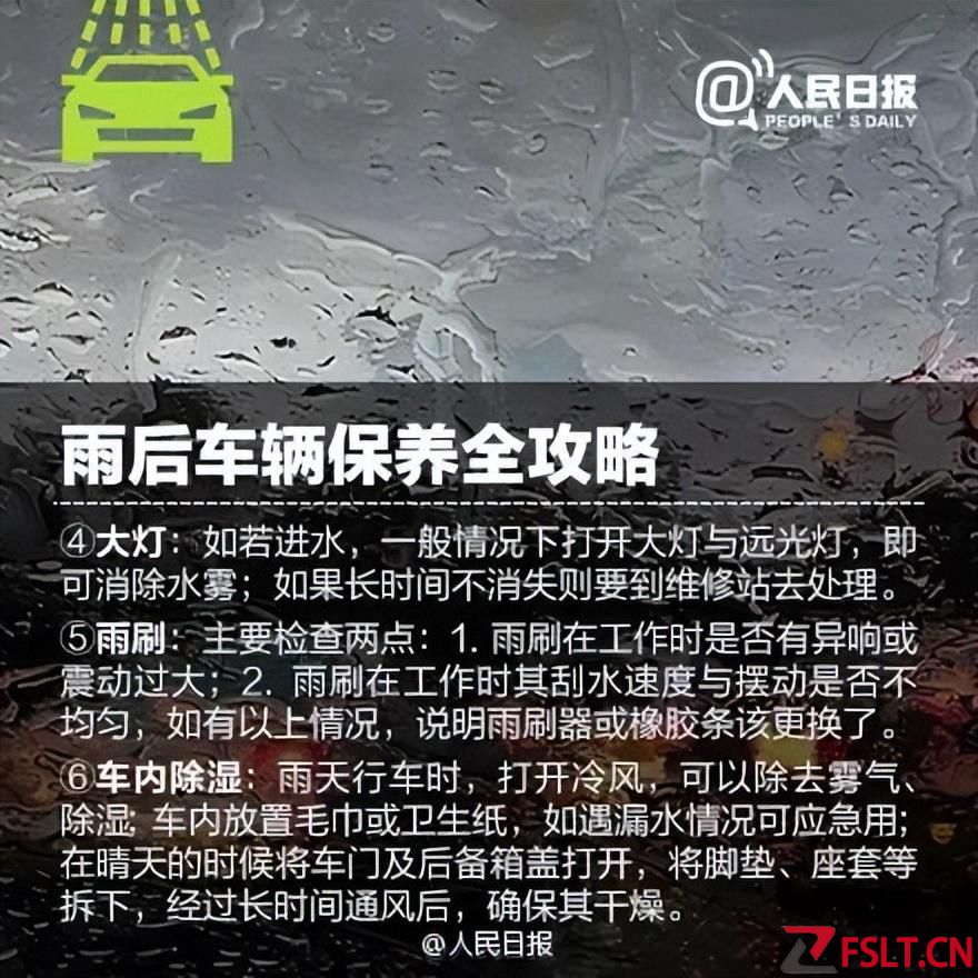⑤雨天注意檢查雨刷器和電路,做好車內(nèi)除菌和車身表面保養(yǎng)。