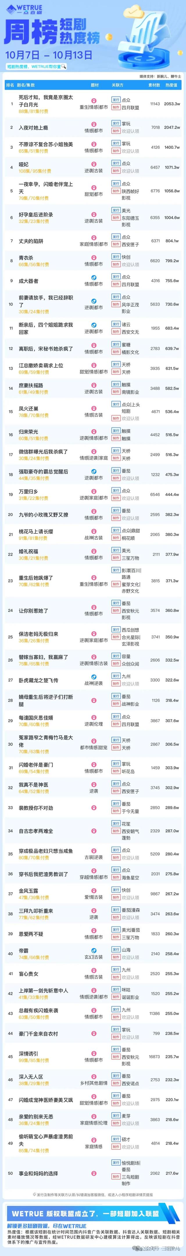 新腕兒、鞭牛士聯(lián)合WETRUE一點(diǎn)查劇共同推出10月第2周短劇熱度周榜,榜單顯示《一夜幸孕,閃婚老伴寵上天》排名第5。《保潔阿姨無(wú)極歸來(lái)》榜上有名,排名第25。此外還有《閃婚老伴是豪門(mén)》在榜。