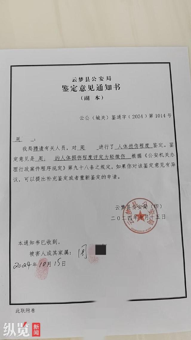 云夢(mèng)縣公安局向周女士出具的鑒定意見(jiàn)書(shū)。(來(lái)源/受訪者提供)