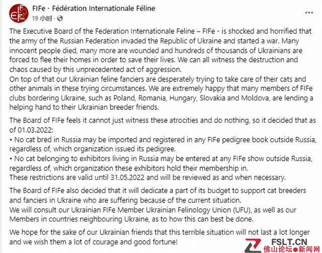 近日,西方多國政府及團體以俄烏局勢為名,宣布對俄羅斯展開了各種形式的制裁,由法國愛貓者在歐洲發(fā)起的FIFe組織也宣布了加入這次對俄羅斯的制裁。