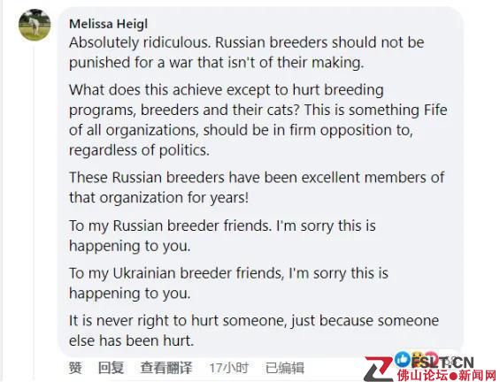 在聲明下最高贊的一條評論就認為,F(xiàn)IFe對俄羅斯飼養(yǎng)者發(fā)出的“制裁”并不合理,除了傷害那些無法左右政局的普通人,對烏克蘭當前的局勢沒有半點幫助。“我們不應該以有人被傷害為理由,去傷害另外一群人”,這條評論寫道。