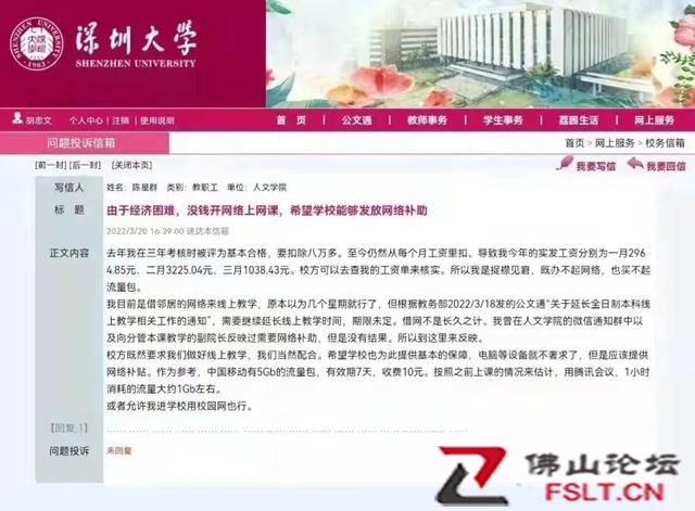 據(jù)科學(xué)網(wǎng)消息,3月20日,深圳大學(xué)人文學(xué)院教職工陳星群在學(xué)校網(wǎng)站留言稱(chēng),“由于我經(jīng)濟(jì)困難,沒(méi)錢(qián)開(kāi)網(wǎng)絡(luò)上網(wǎng)課,希望學(xué)校能夠發(fā)放網(wǎng)絡(luò)補(bǔ)助”。