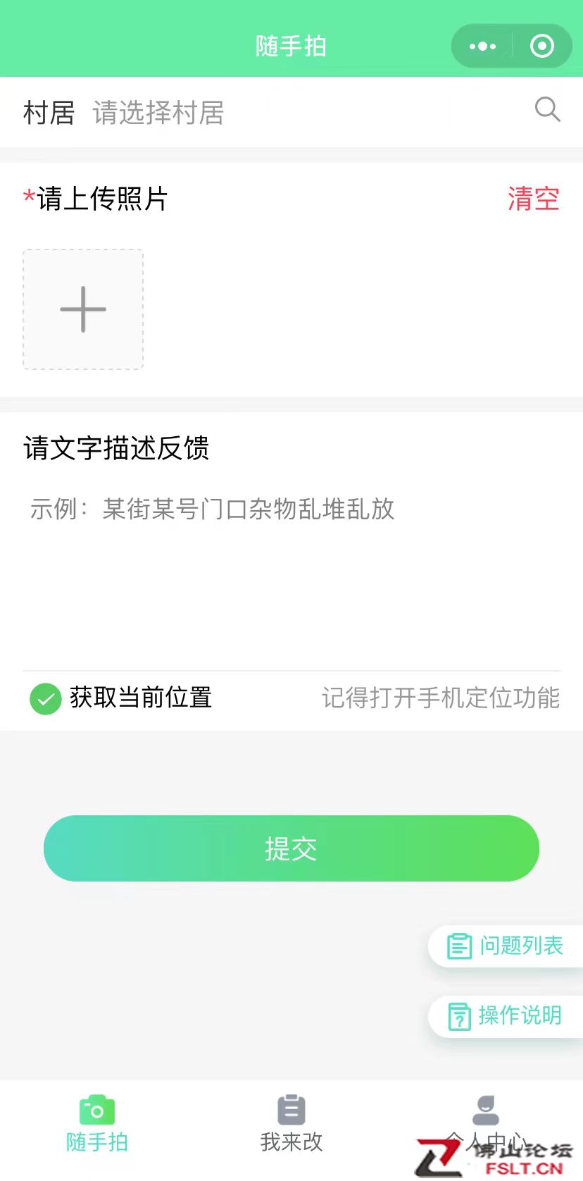 2、進(jìn)入“隨手拍”界面,在搜索框選擇村居,上傳問題近遠(yuǎn)照片、文字描述問題內(nèi)容,提交。